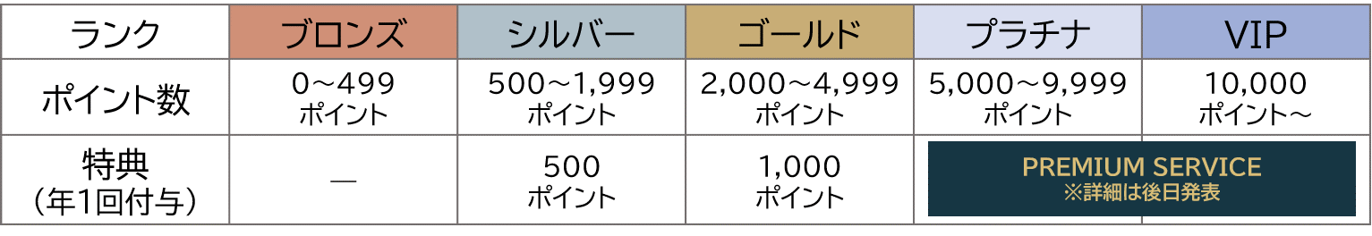 毎年4月~翌年3月の間に獲得したポイント数に応じて、翌年5月からのランクが決定します。ランクに応じて、ポイントなどのランクアップ特典をプレゼントいたします。